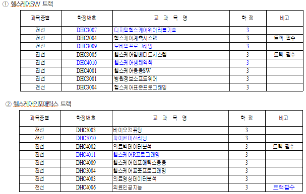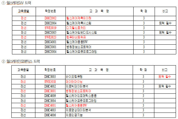※ 기존 데이터베이스 교과목에서 DHC3011 의료데이터베이스 교과목이 신설되면서 트랙필수 교과목이 교체됨.